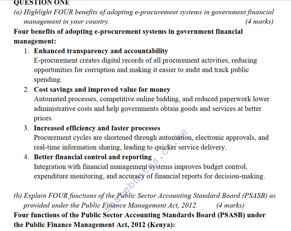 (a) Highlight FOUR benefits of adopting e-procurement systems in government financial management in your country. (4 marks)